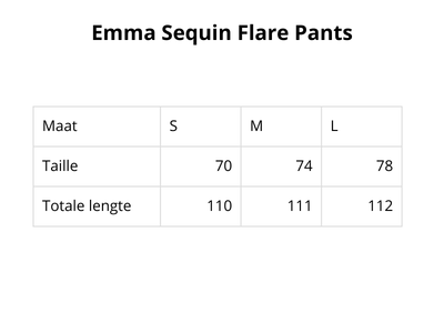 Maak een statement met de Emma broek, een schitterend item vol met elegante pailletten. Deze broek heeft een flatterende hoge taille en een wijd uitlopende pijp, wat zorgt voor een stijlvolle en feestelijke look. Of je nu kiest voor klassiek zwart, warm bruin of diep bordeauxrood, in deze broek ben jij het stralende middelpunt van elke avond!